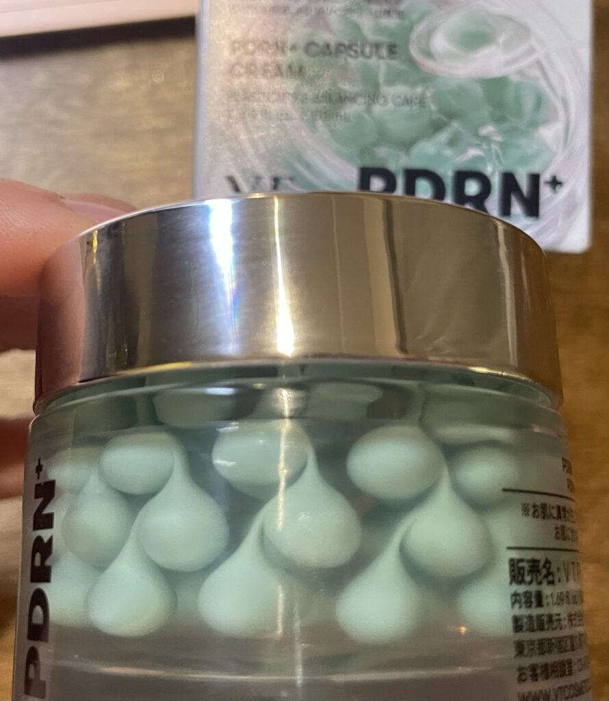 SNSで「集合体クリーム」と呼ばれる、VT>>PDRNカプセルクリーム は、この緑色のつぶつぶカプセルがポイント!