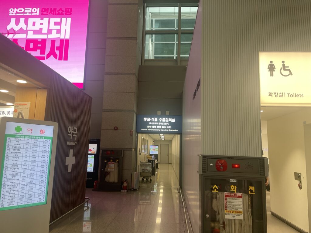仁川空港・出発ロビーにある「動植物携帯輸出検疫室」は、出発ロビー3階、⑦番出入り口に近い「G」カウンター付近の奥にあります。横に薬局とトイレにあるのが目印。